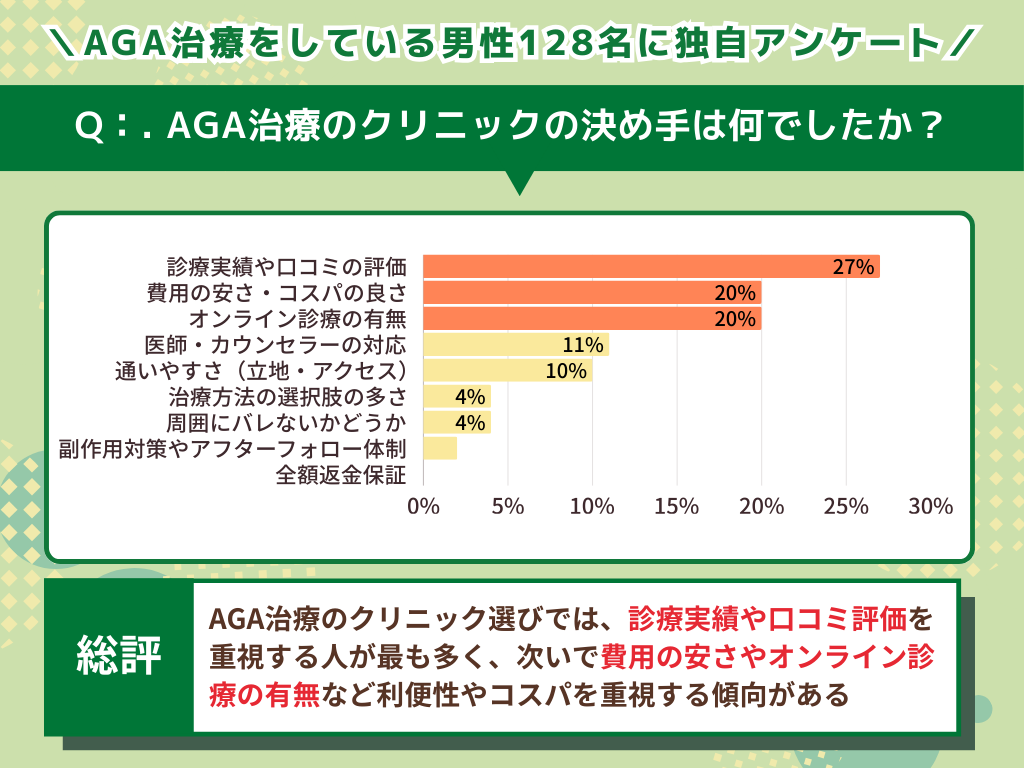 また、AGA治療経験のある男性128名を調査した独自アンケートでクリニック選びの決め手について質問したところ、このような結果になりました。