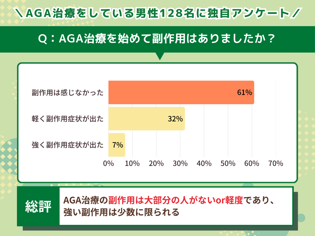一方、実際にAGA治療を経験した人に副作用について質問したところ、結果はこのような割合となりました。