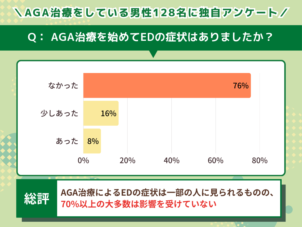 また、実際にAGA治療経験者を対象にEDの発現状況を調査したところ、76%の人はなかったと答えていますが、一部では症状を感じたケースがありました。