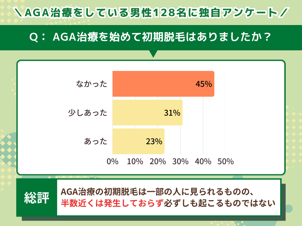 実際にAGA治療をした人への調査でも、初期脱毛がなかった人は半数以下で、半数以上は大なり小なり初期脱毛を経験したという結果となりました。
